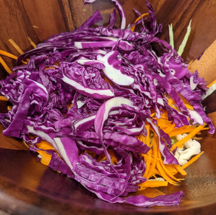 Cut the green and purple cabbages, carrot, and pickles into thin strips. Throw into a large bowl and combine with the mayonnaise. Set aside.