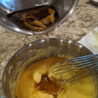 Once the milk mixture is cooled, whisk in the egg yolks one at a time. Then add the lemon peel syrup, and mix until everything is well-combined.